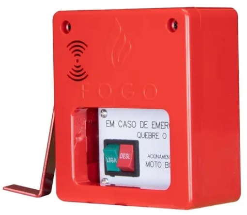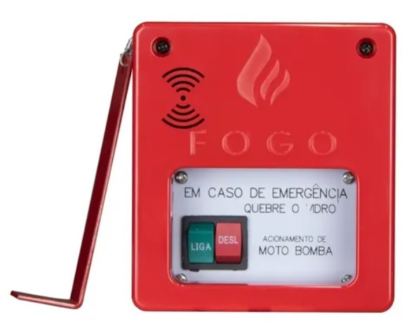 Em caso de incêndio basta quebrar o vidro com o martelinho e acionar a chave “LIGA”.